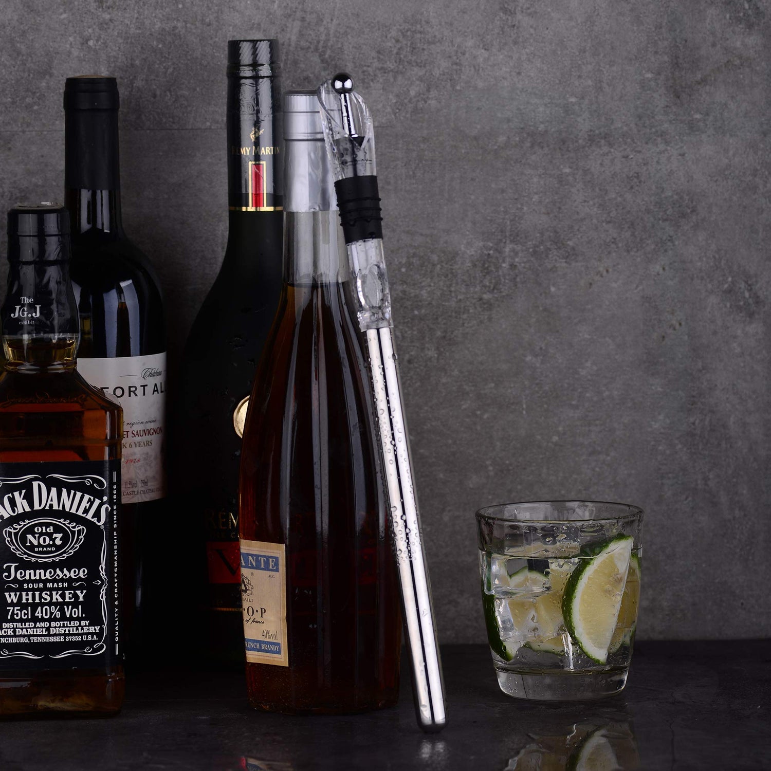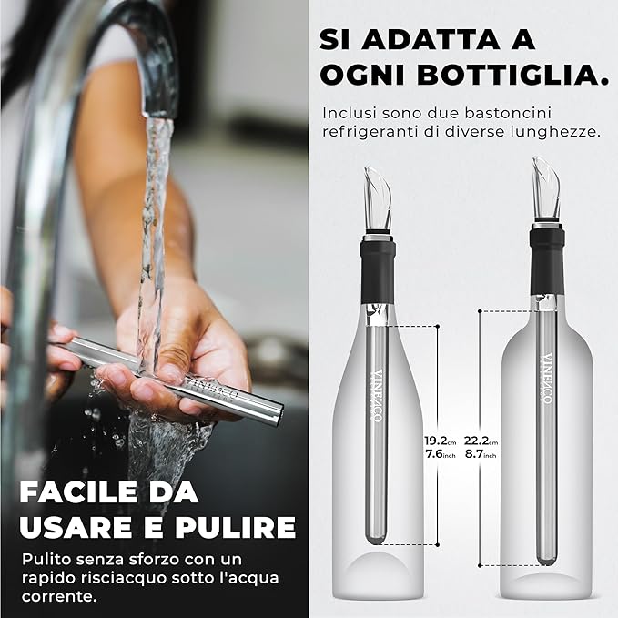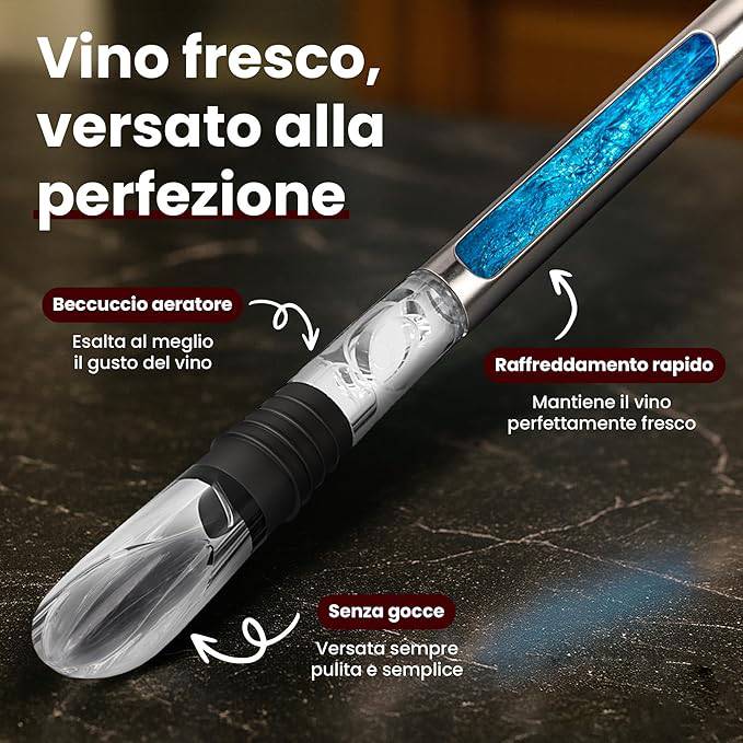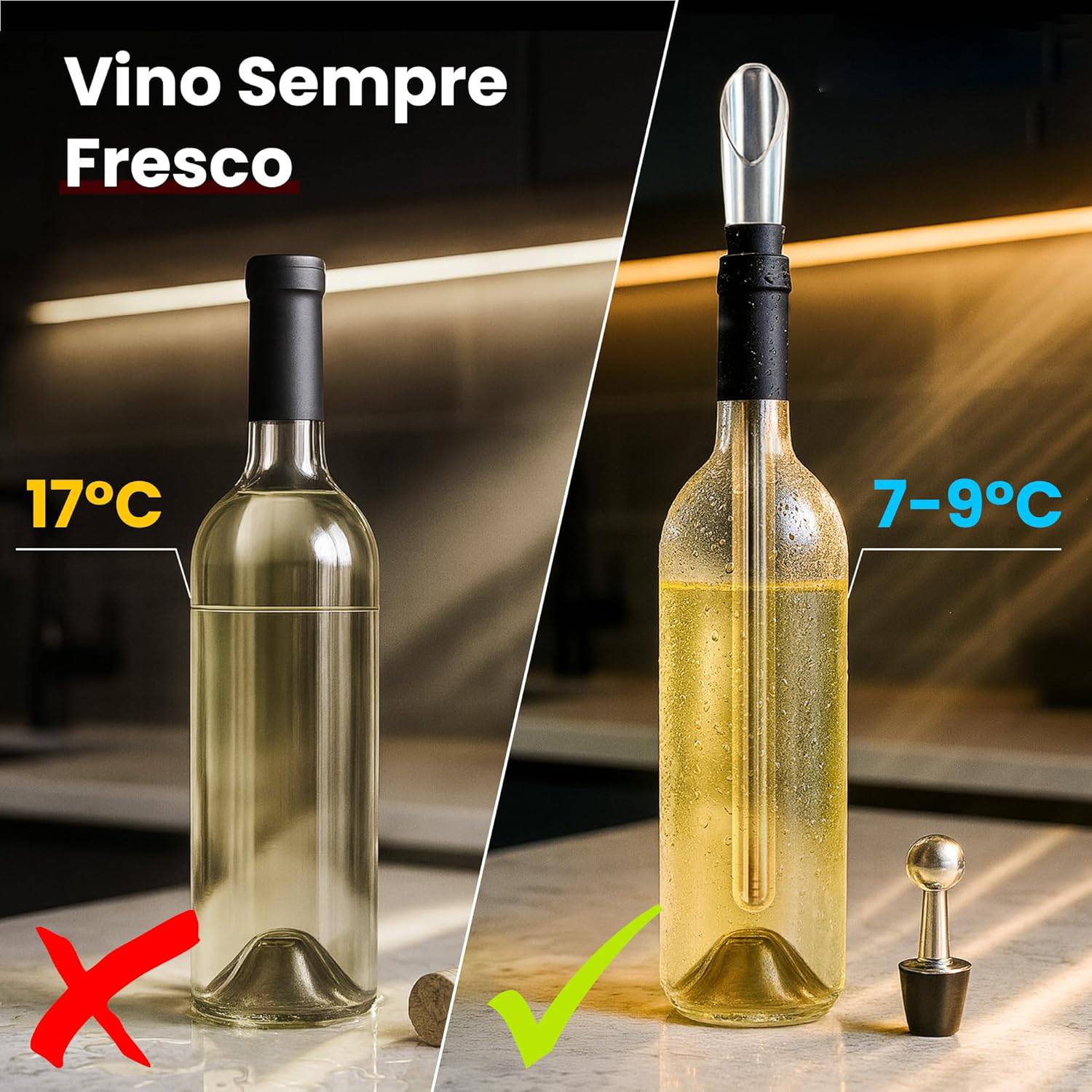 Il raffreddatore si inserisce direttamente nella bottiglia dopo essere stato tenuto in freezer: mantiene il vino fresco più a lungo senza bisogno di secchielli o ghiaccio.